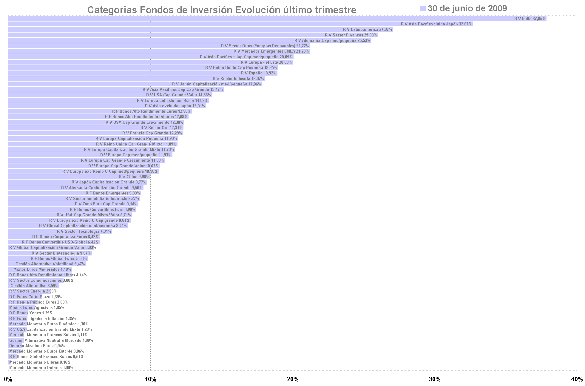 Les muestro en esta entrada varios gráficos en los que intento abordar la dispar evolución de una selección de categorías y sectores de fondos de inversión. Los gráficos abarcan diversas ventanas temporales. Haciendo click sobre el gráfico conseguirán que se amplíe y se incremente la calidad del mismo.