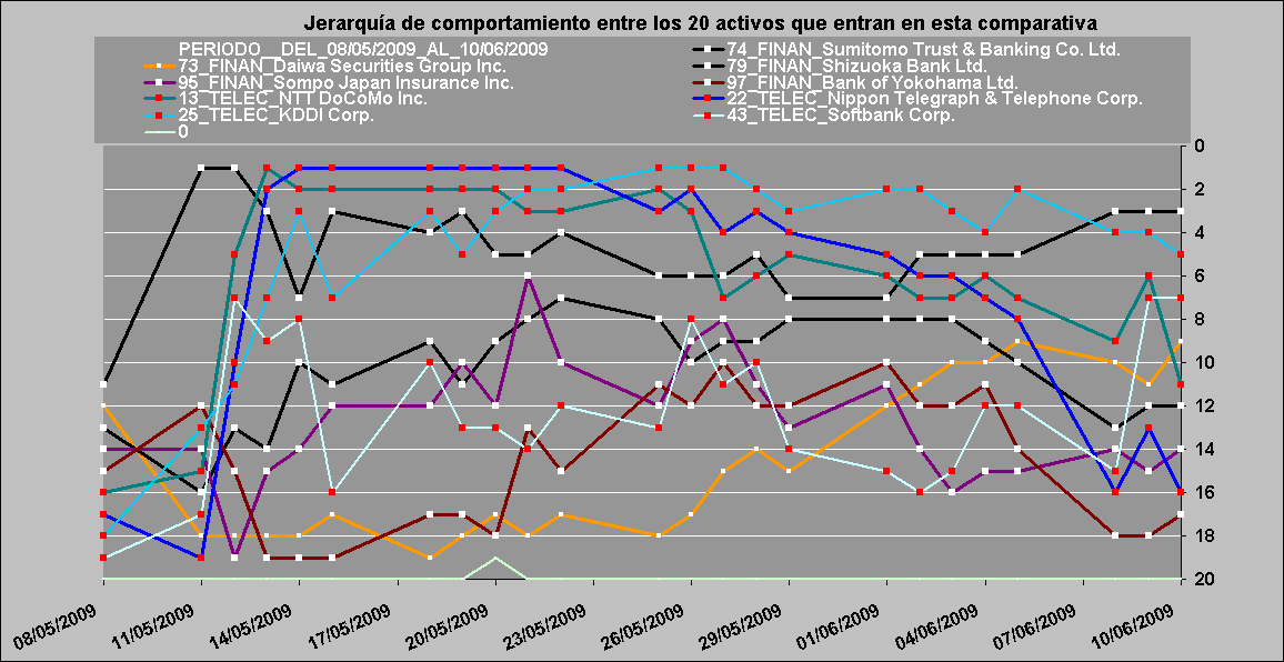 Los sectores directores del rebote siguen copando los primeros puestos en las distintas comparativas de sectores, si tomo como referencia lo ocurrido desde el 9 de marzo. Hay que tener en cuenta que la inercia provocada al tomar como referencia la cotización con que cerraron el 9 de marzo de 2009 puede provocar que las transiciones en la ubicación jerárquica de las compañías de los distintos sectores se demore algunas sesiones. Mientras estos sectores no aflojen deberíamos asumir que el rebote sigue vigente. Se comparan, como sectores considerados directores, FINANCIERO, CONSUMER GOODS Y TECNOLÓGICO y como sectores refugio HEALT CARE, TELECOMUNICACIONES y UTILITIES.