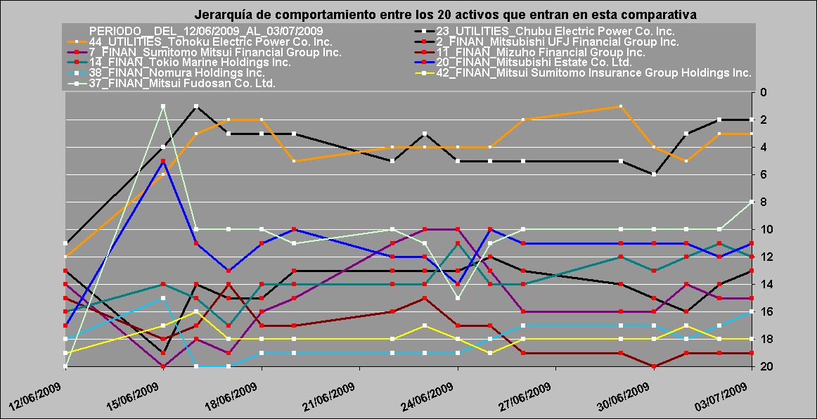 Los que hayan seguido las entradas que he ido colgando, casi a diario, con las reflexiones que me aportan los gráficos que genera la herramienta que he montado para vigilar la evolución de las 150 compañías que más ponderan en el mercado nipón, fueron partícipes del evento significativo del viernes 12 (incremento significativo del volumen negociado) y como desde entonces, las compañías del sectorial financiero fueron perdiendo posiciones en las jerarquías de comportamiento comparado frente a las empresas de los sectores refugio. La situación continúa, el volumen del viernes 3 de julio ha sido el menor desde el 12 de junio (seguramente influido por la festividad en Wall Street) y los valores del sectorial financiero siguen sin ascender posiciones en las jerarquías de comportamiento comparado .