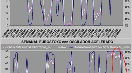 El 2º gráfico refleja la evolución del índice Eurostoxx 50 desde la órbita de las curvas de desviación estándar acumulada. Con esta herramienta se transforma el devenir de un activo en un oscilador que se moverá entre extremos de +2 y –2 desvest, en condiciones de volatilidad “controlada”.