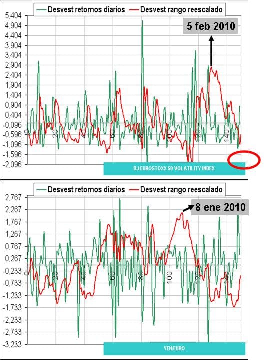 El 2º gráfico muestras las curvas de desviación estándar acumuladas sobre 150 sesiones del DJ EUROSTOXX 50 VOLATILITY INDEX y del cruce YEN/EURO, como referencias indirectas de dónde podemos encontrarnos. Ambos generaron señales atinadas sobre el 8 de enero avisando de techos en las bolsas y el índice de volatilidad también generó una señal eficiente alertando de un posible suelo en las bolsas el 5 de febrero. Sin embargo, la curva del yen/euro no se ha apuntado a las alzas de la última semana propiciando una divergencia bajista peligrosa. Hemos resaltado con una elipse roja la zona a la que debería acercarse el índice de volatilidad para pensar que el rebote habría concluido, según esta herramienta.