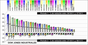 Analizamos los valores de Dow Jones industriales en el periodo alcista 4/10 a 27/10 y su evolución en la posterior consolidación que estamos viviendo y que se origina en los máximos del 27/10.