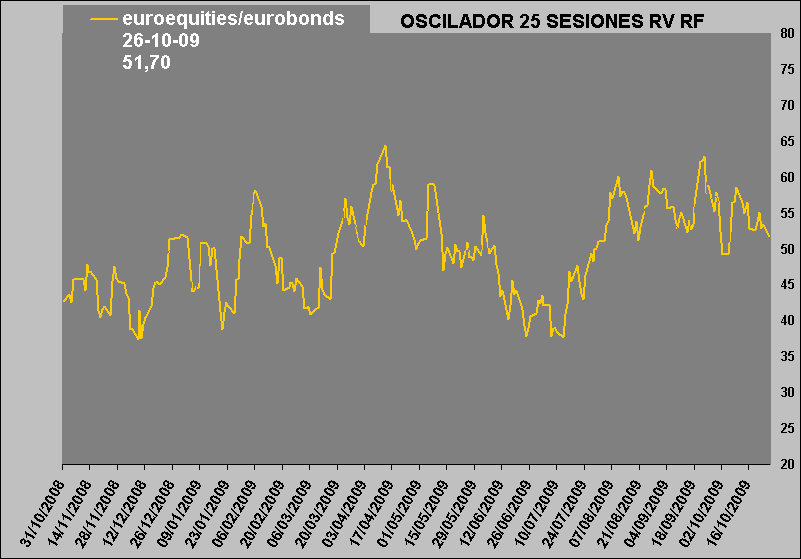 Si como argumentamos ayer (VER POST QUE COLGAMOS AYER EN ESTE BLOG)desde hace un par de semanas la herramienta de probabilidad de éxito nos avisa de una evidente DIVERGENCIA BAJISTA (hay que recalcar que una divergencia bajista es una condición necesaria pero no suficiente para asegurar que una tendencia es bajista), tenemos a nuestra disposición una herramienta (OSCILADORES DE RV vs RF) que puede confirmar el momento del giro a la baja que terminaría confirmando la divergencia.