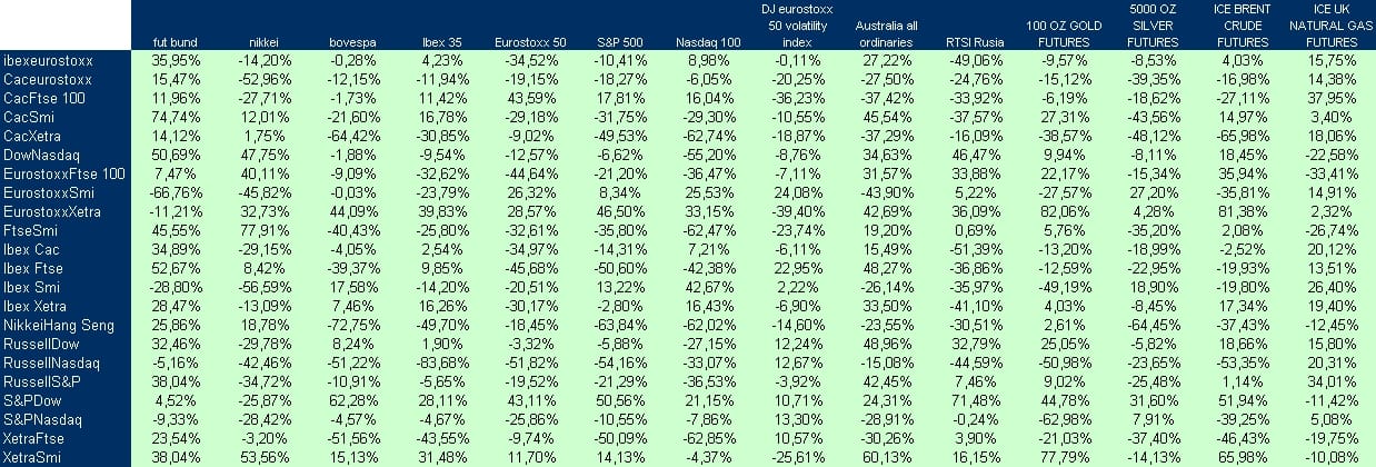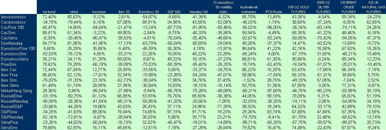 Estos dos cuadros requieren mucho estudio y reflexión ya que hay pares que presentan elevada correlación con índices que ha mostado fuertes subidas durante la semana pasada y viceversa, long short que han mostrado absoluta descorrelación en el proceso de subida de las bolsas. Lo verdaderamente relevante será detectar que pares se descorrelacionan de las bolsas cuando estas caen, ya que ahí tendremos una forma de diversificar muy eficiente.