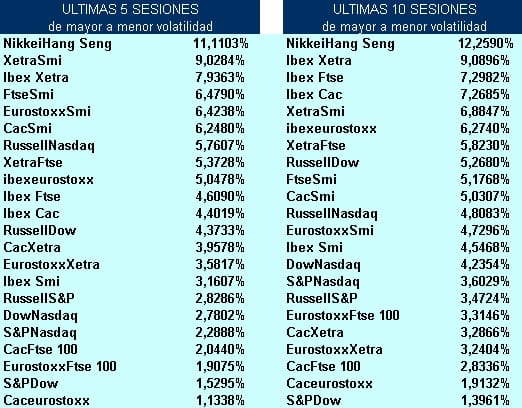 La volatilidad se presenta jerarquizada, desde el par que ha presentado mayor volatilidad hasta el que menos. Como pueden ver el par Nikkei vs Hang Seng es el que presenta mayor desviación típica tanto si se calcula sobre los retornos generados en las últimas 5 y 10 sesiones bursátiles.