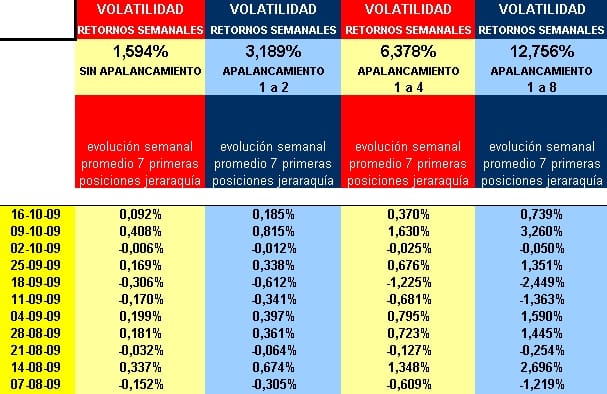 En la siguiente tabla tienen la evolución semanal desde comienzos de agosto de 2009. También en esta tabla tienen la volatilidad anualizada que se genera con los retornos semanales que aporta esta metodología. Empezamos a aportar estadísticas que suele presentar la industria de Hedge funds. Con cierta habilidad, ya que al aportar datos de volatilidad semanales o mensuales suelen ser menores que los obtenidos a partir de los retornos diarios, esta industria se especializó en refrendar su operativa con estadísticas semanales y mensuales.